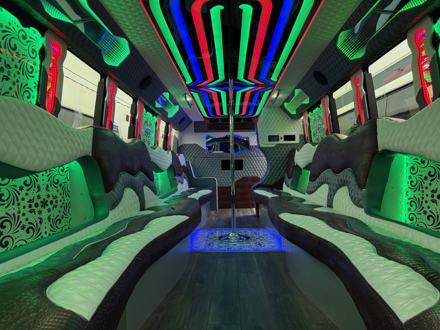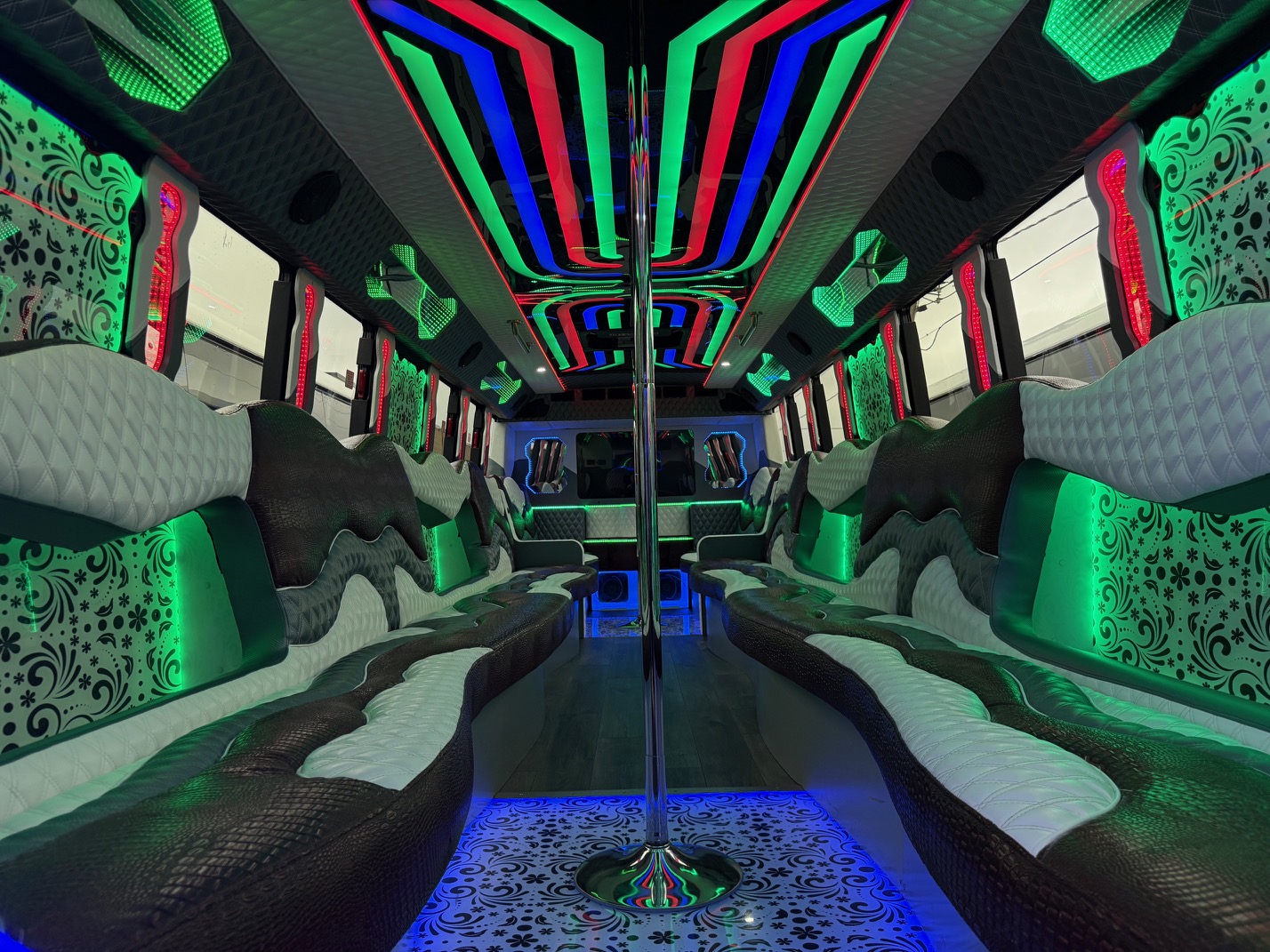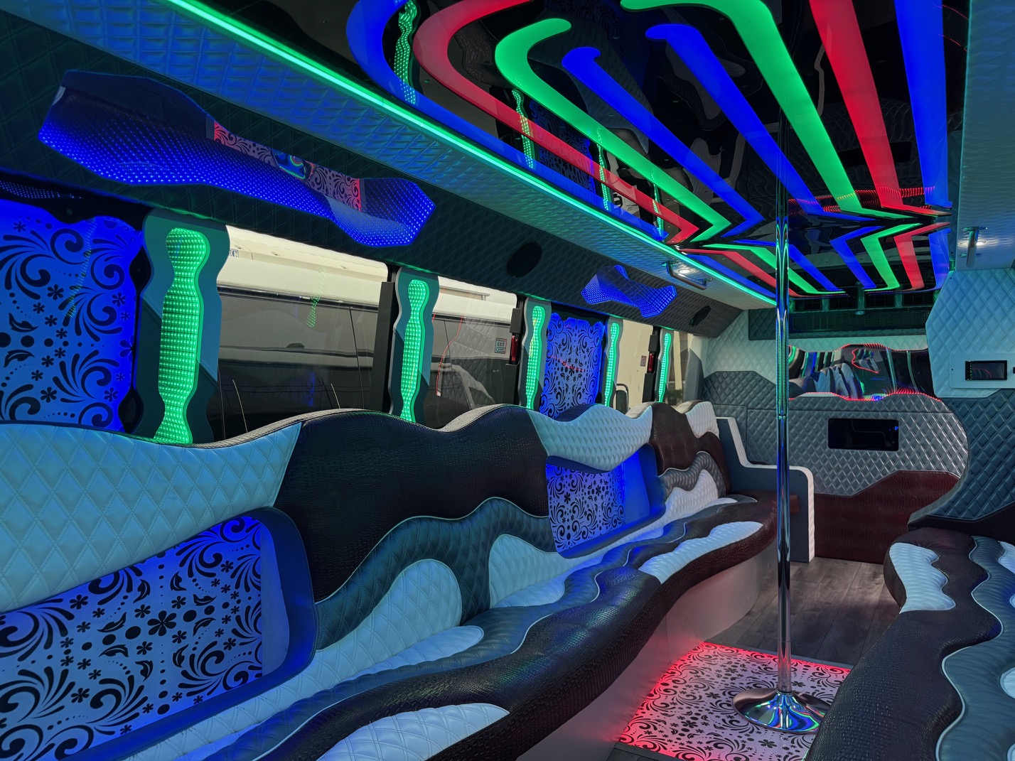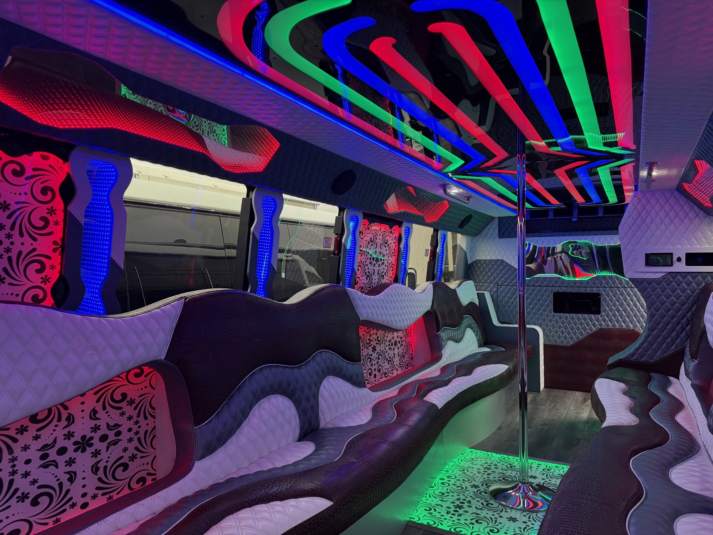 Step into a one-of-a-kind experience with our Galaxy 40 passenger party bus rental. Designed with a futuristic theme and vibrant lighting, this party bus is perfect for weddings, birthdays, proms, bachelor/bachelorette parties, concerts, and corporate events. Enjoy a luxury ride across Chicago with style and comfort.