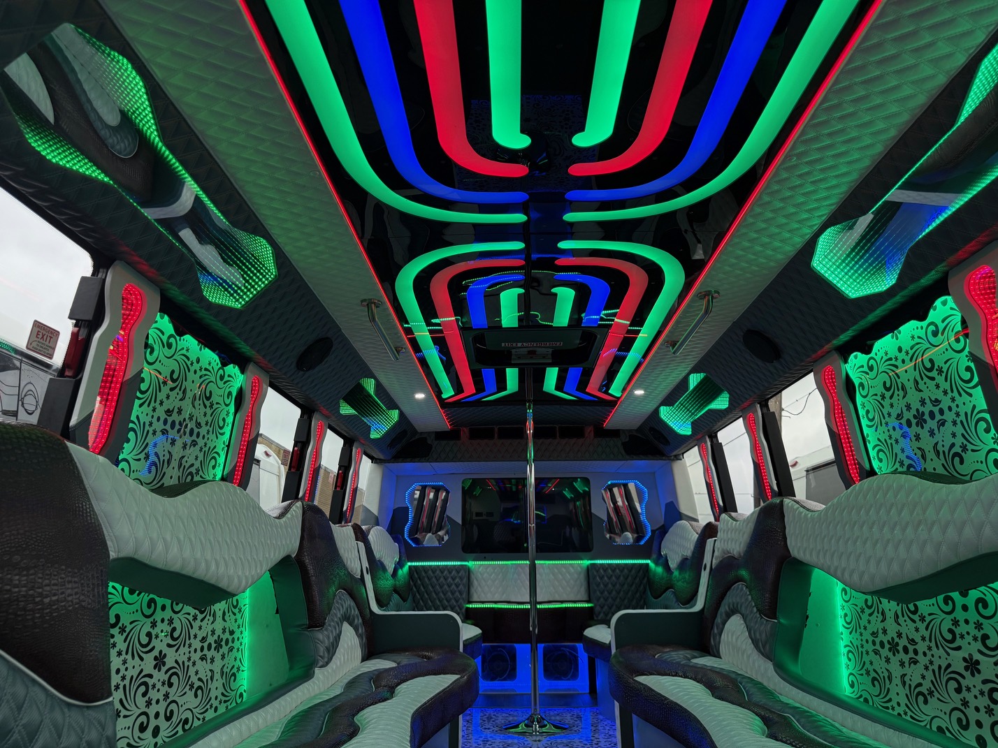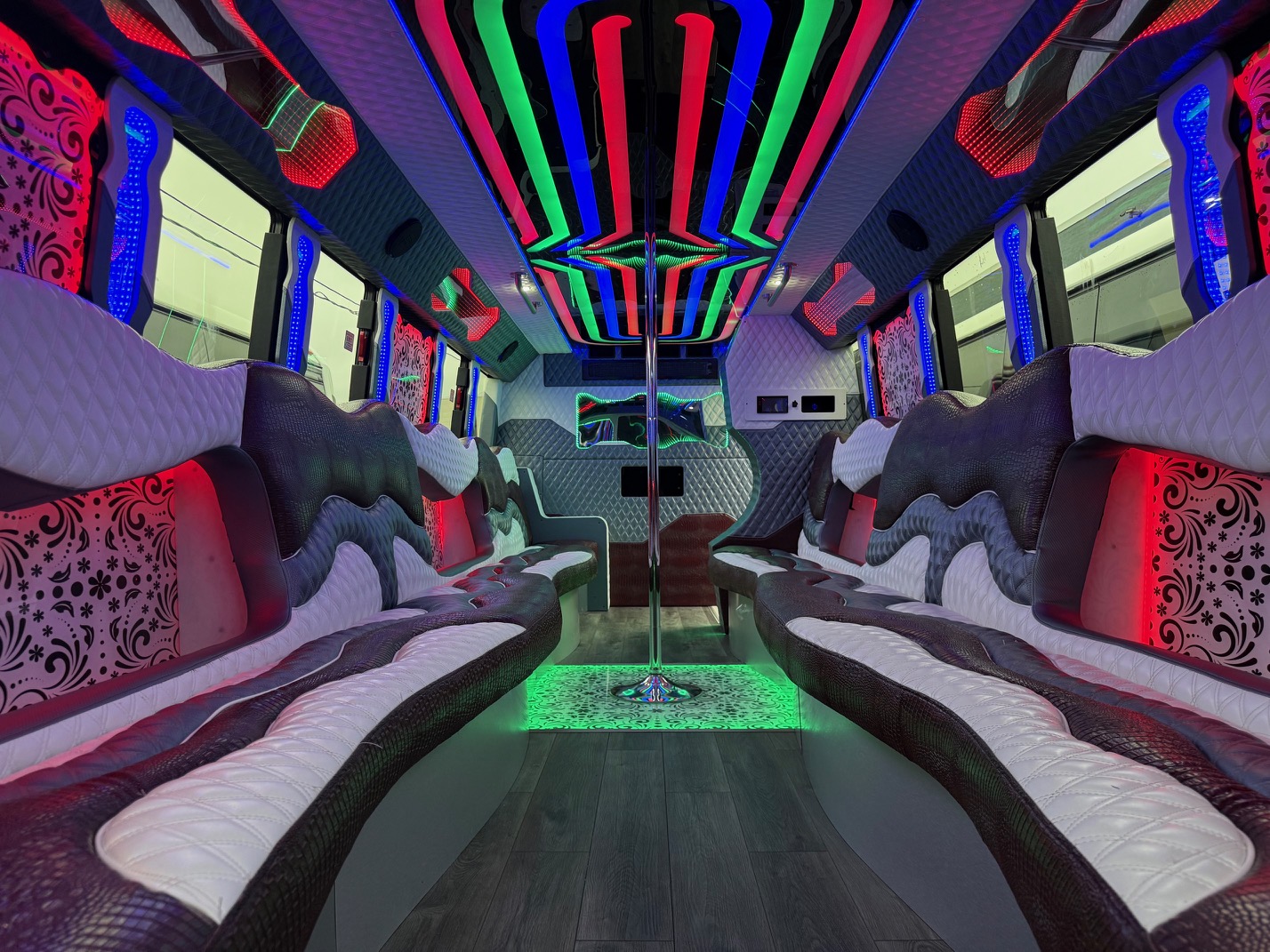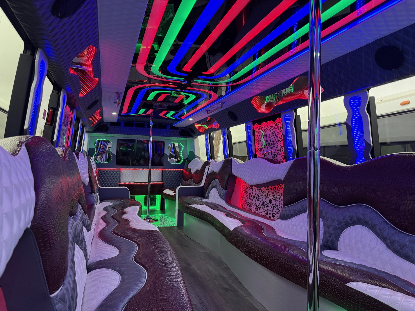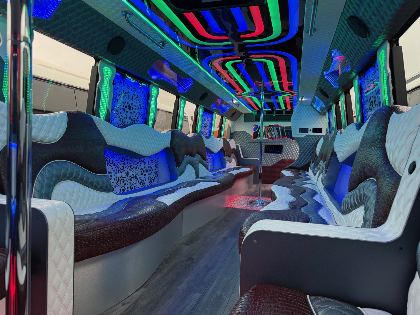 Step into a one-of-a-kind experience with our Galaxy 40 passenger party bus rental. Designed with a futuristic theme and vibrant lighting, this party bus is perfect for weddings, birthdays, proms, bachelor/bachelorette parties, concerts, and corporate events. Enjoy a luxury ride across Chicago with style and comfort.