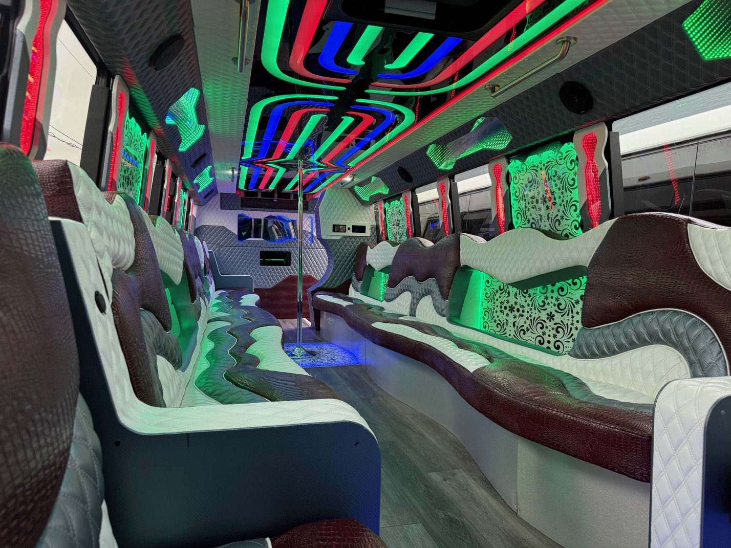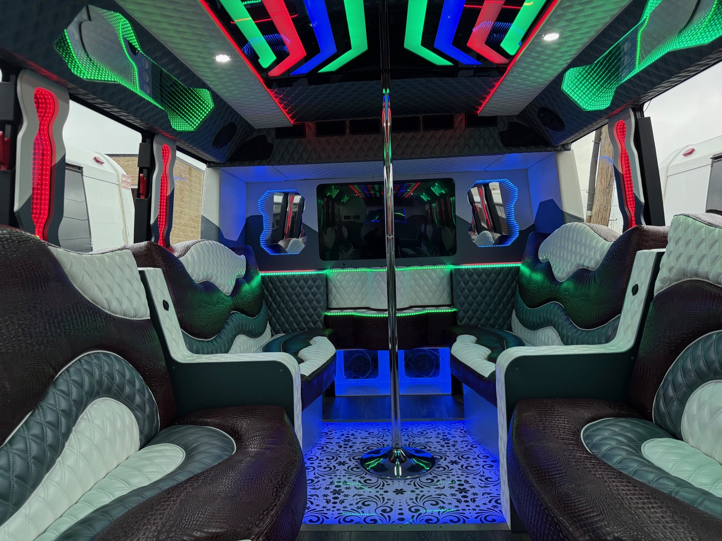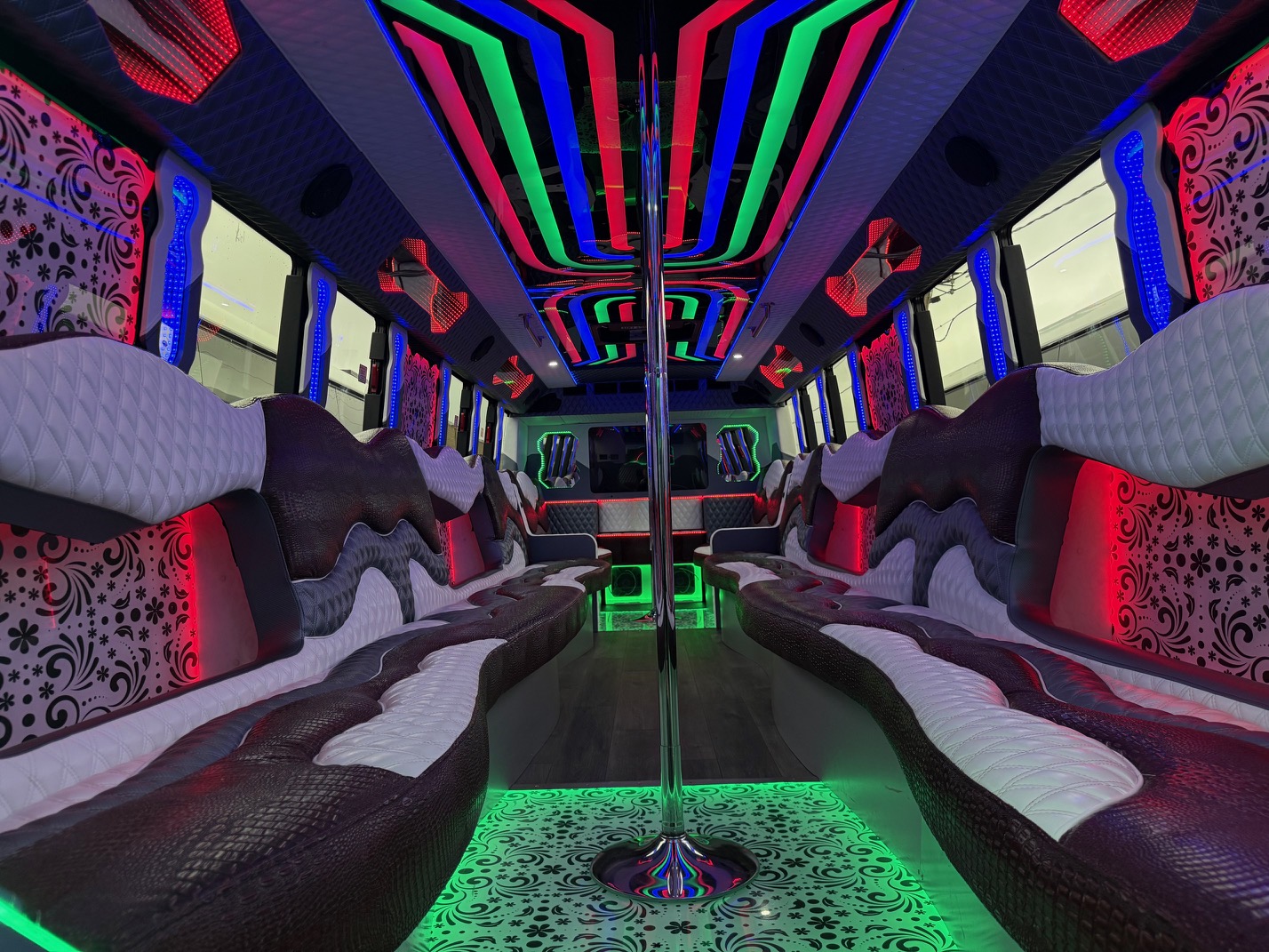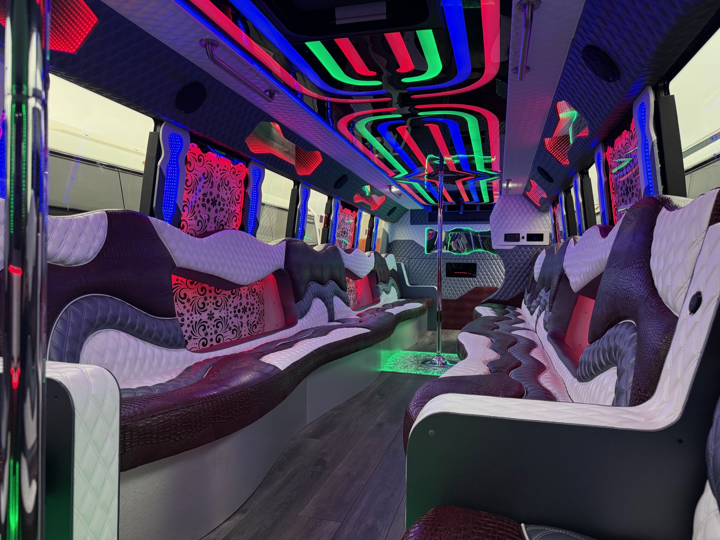 Step into a one-of-a-kind experience with our Galaxy 40 passenger party bus rental. Designed with a futuristic theme and vibrant lighting, this party bus is perfect for weddings, birthdays, proms, bachelor/bachelorette parties, concerts, and corporate events. Enjoy a luxury ride across Chicago with style and comfort.