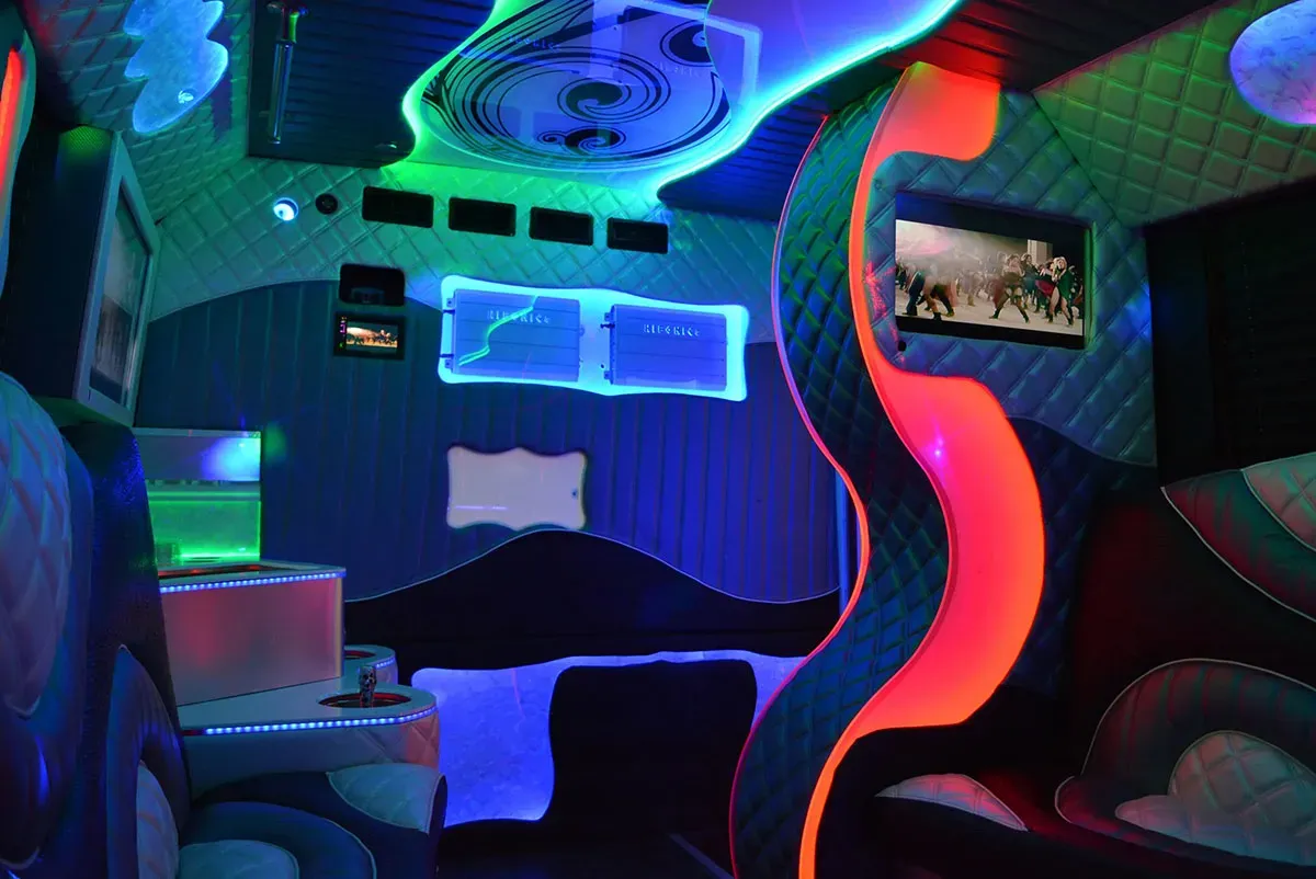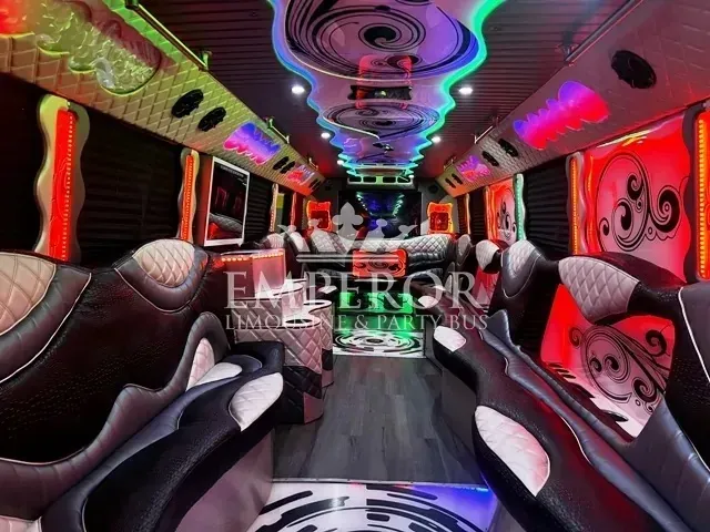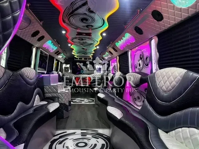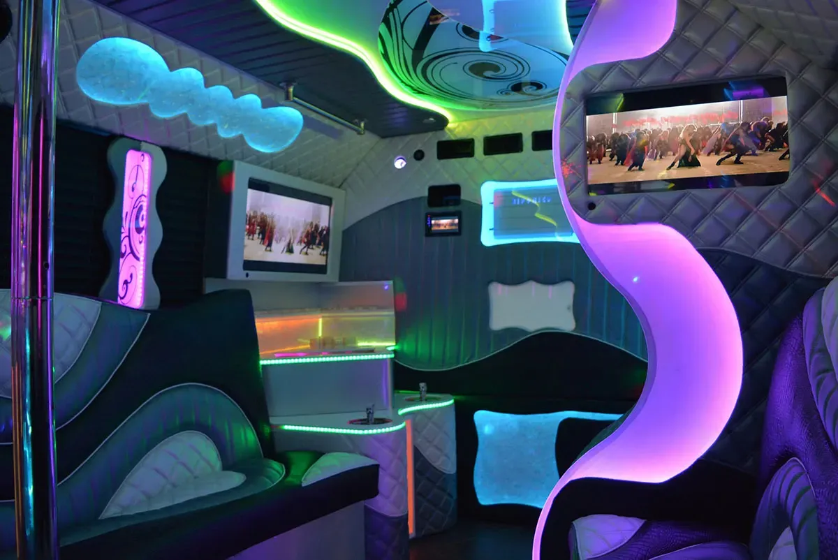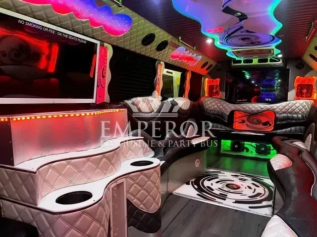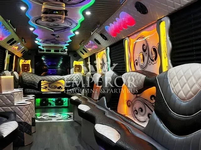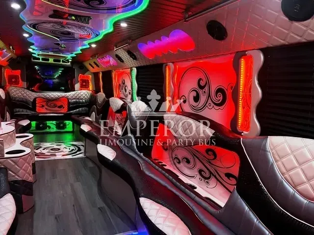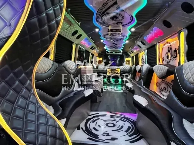 Like a real club, a 36-person party bus in Chicago is ready for a mind-blowing evening. Inside you’ll find robust sound systems, a spacious dance floor, LED TVs, and colorful lights with a disco ball to support the atmosphere of your celebration. There are comfortable leather seats, a conditioning system, and a custom interior for your guests’ comfort.