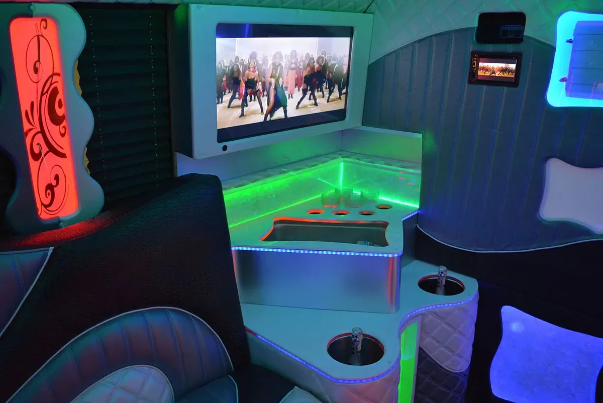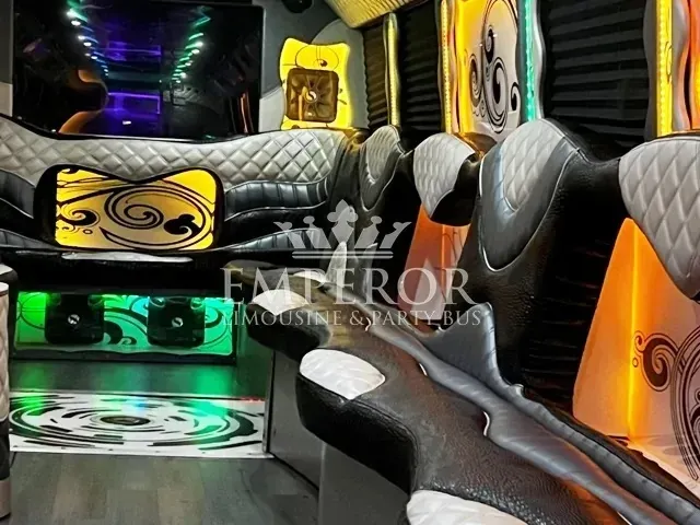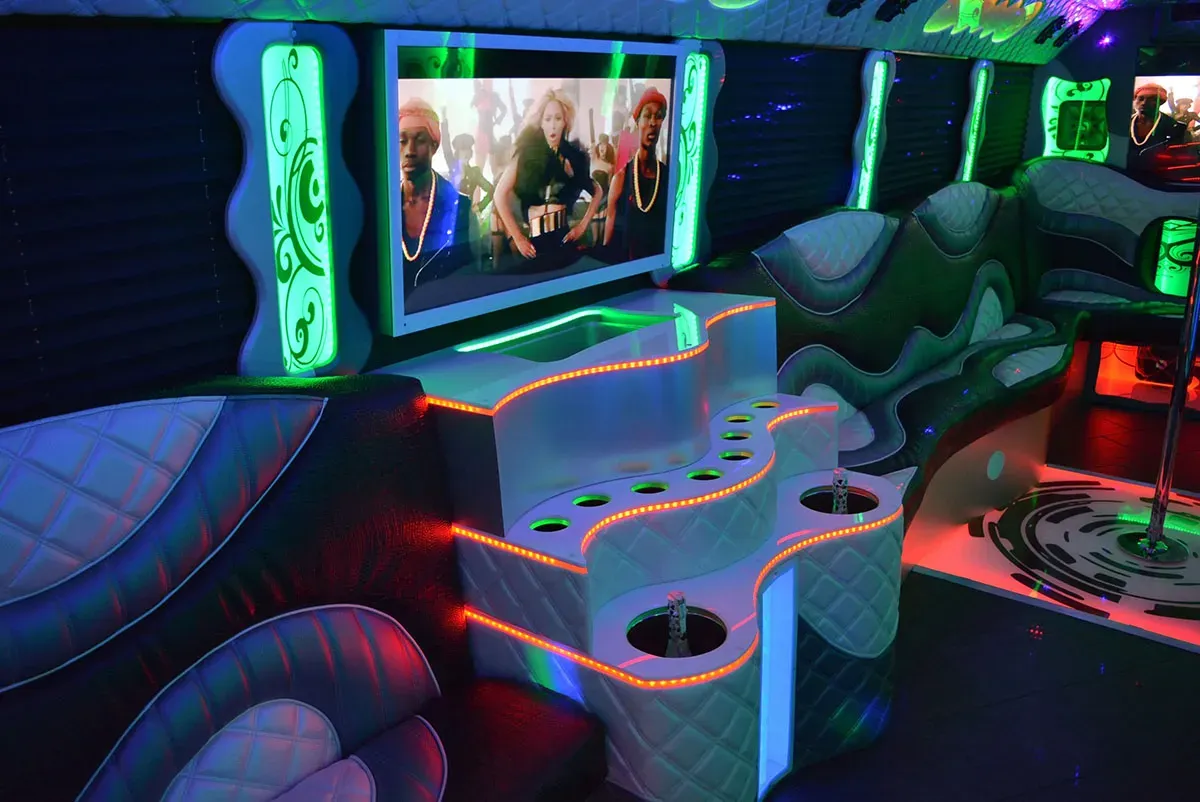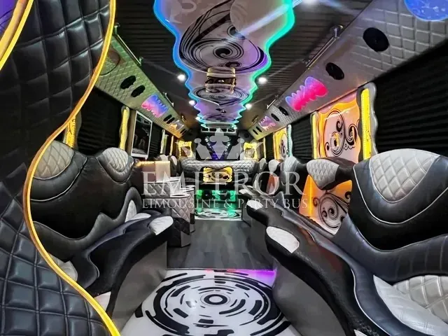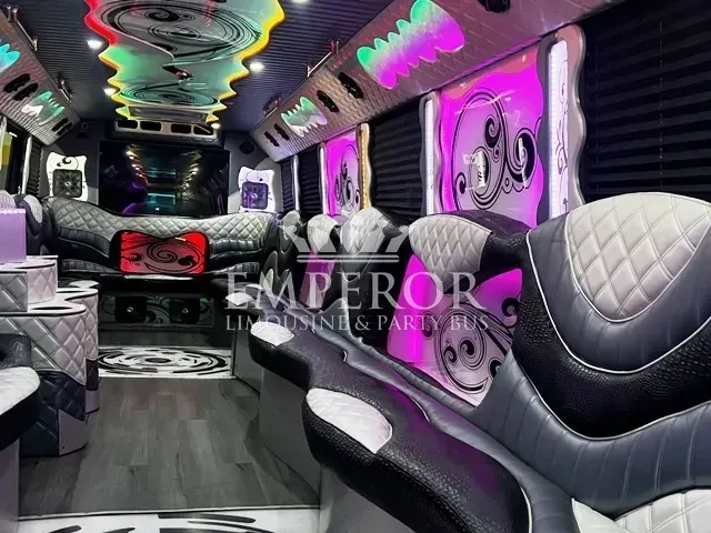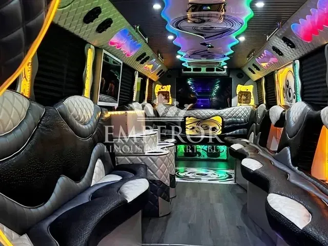 Like a real club, a 36-person party bus in Chicago is ready for a mind-blowing evening. Inside you’ll find robust sound systems, a spacious dance floor, LED TVs, and colorful lights with a disco ball to support the atmosphere of your celebration. There are comfortable leather seats, a conditioning system, and a custom interior for your guests’ comfort.